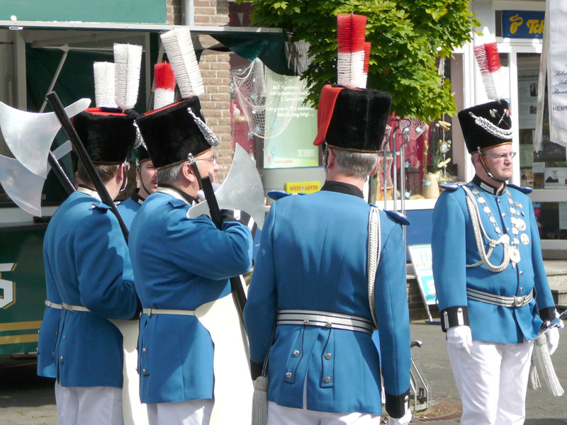 Erkennbar waren die Sappeure schon von weitem an ihrem rot/weißen Federschmuck, dem "Pützer". Dieser war früher aus Büffelhaar und saß auf einer Bärenfellmütze, dem Tschako.